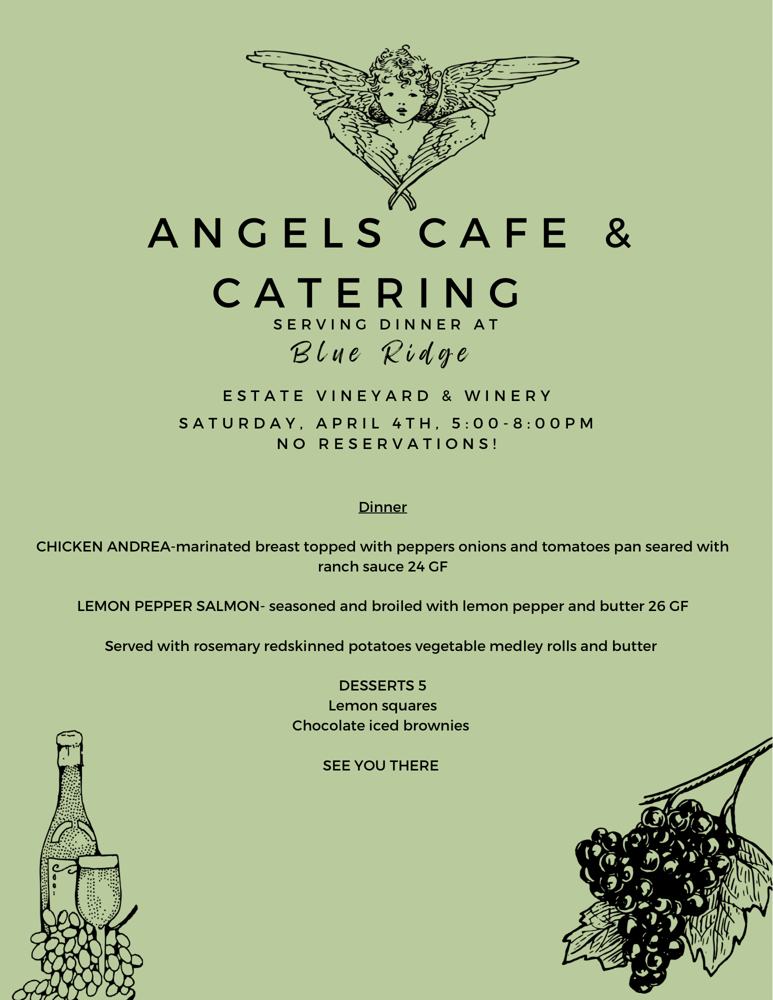 Join us for Friday Night Dinner from Taste of Italy and Saturday Night Dinner by Angels Cafe & Catering!